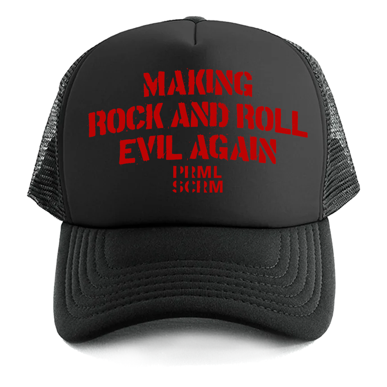 PRML SCRM making Rock and Roll Evil Again black trucker hat.